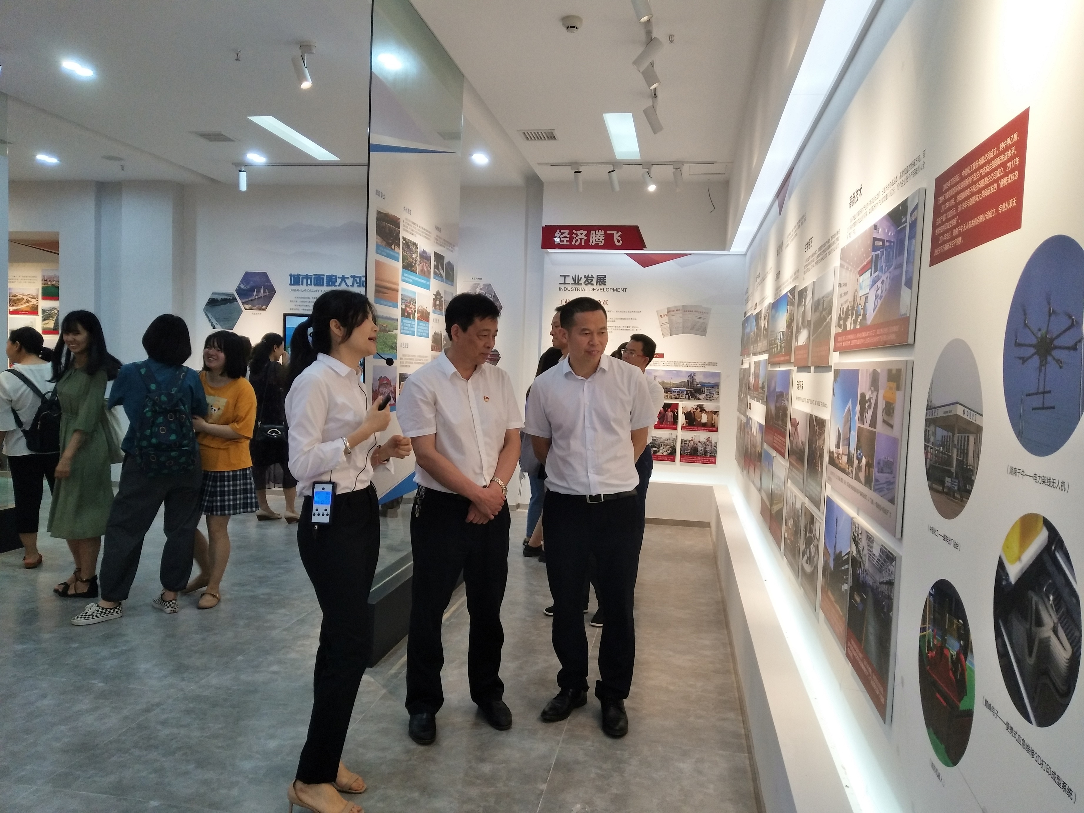 湖南理工学院党委书记李明(中)在市档案馆党组书记、馆长余友安(右一)陪同下参观展览