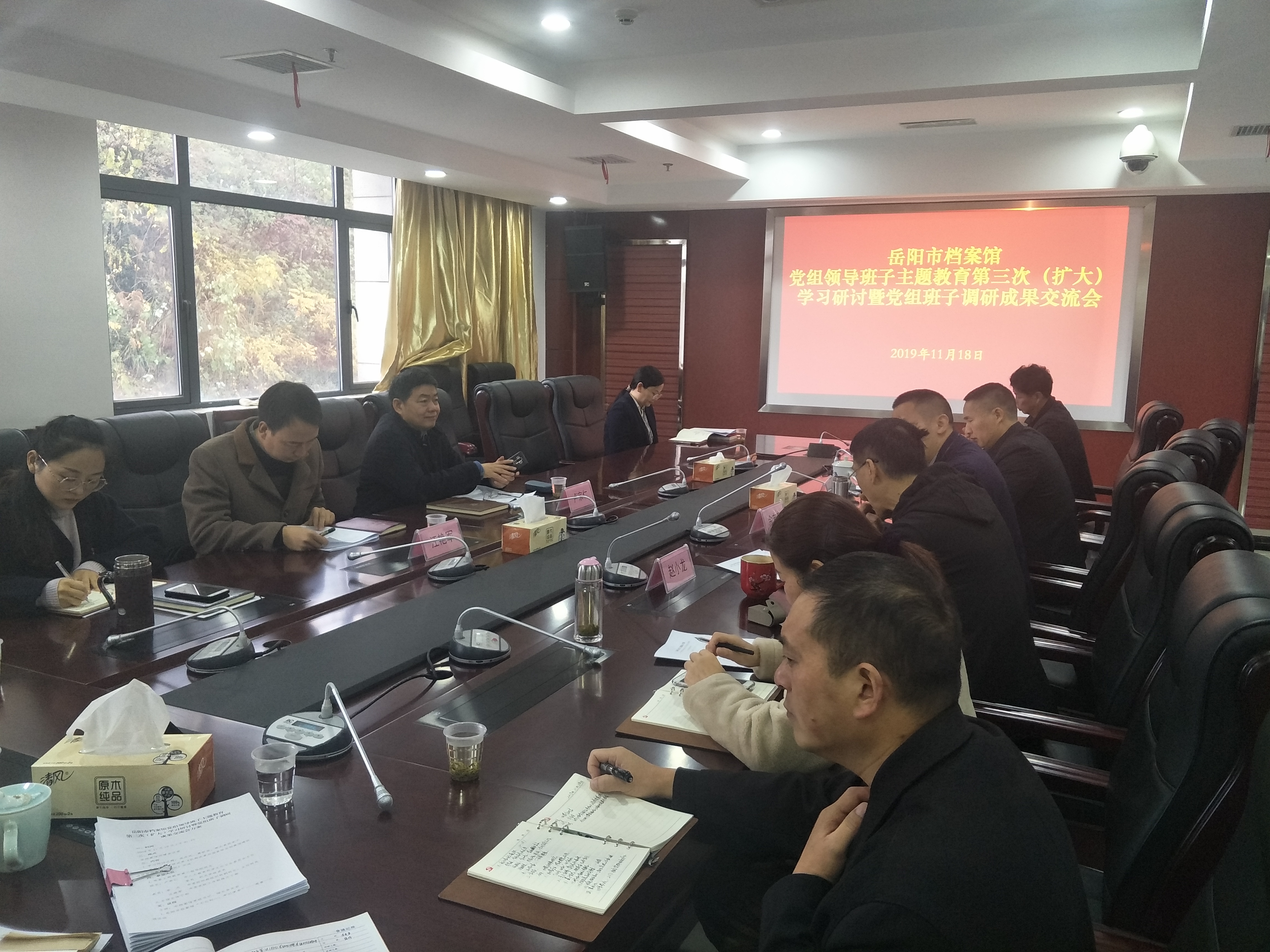 11月18日上午,市档案馆召开党组领导班子主题教育第三次(扩大)研讨交流暨党组班子调研成果交流会。会议由党组书记、馆长余友安主持,市委主题教育第三指导组组长卢宗仁、成员汪艳军到会指导,全馆党员干部参加。