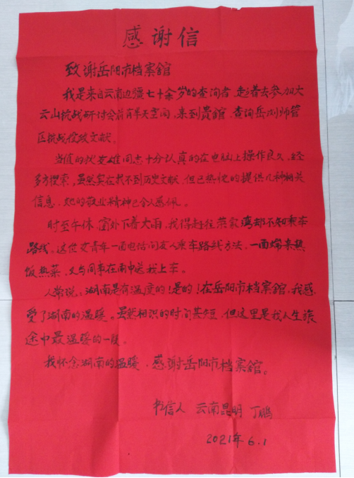 尽管没有找到相关档案,但丁老回云南后,对在岳阳市档案馆所受到的热情接待难以忘怀,她特意用大红纸写了封感谢信,并通过邮政快递寄来。她在感谢信结尾时满怀感谢写道:虽然相识的时间甚短,但这里是我人生旅途中最温暖的一段,我怀念湖南的温度!感谢岳阳市档案馆!
