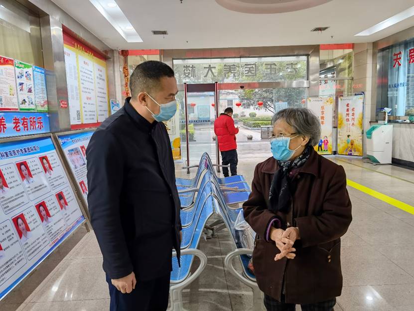 来到市康复医院,因疫情防控要求,不能上楼探望老同志胥淑英。余友安一行便在住院部大厅,跟胥老亲切交流,祝福年近90高龄的胥老身体健康,提前给胥老拜年。
