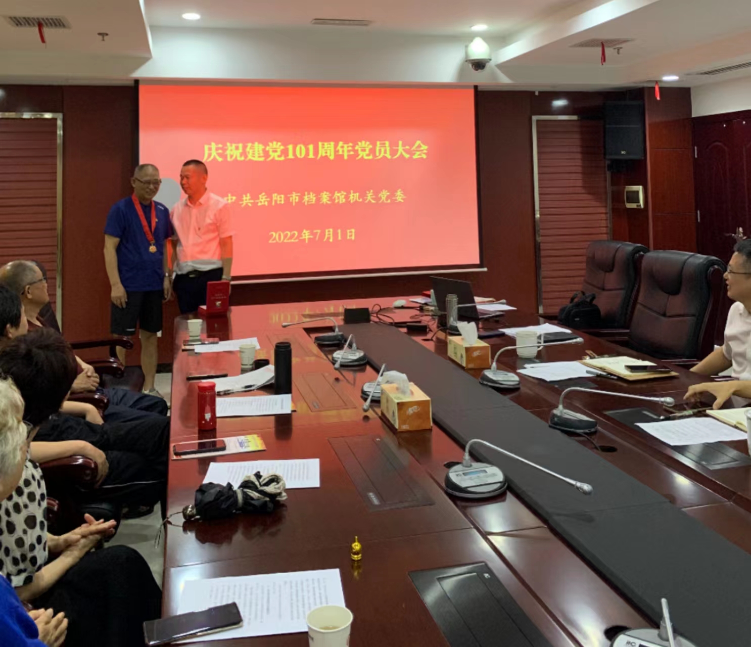 会上,余友安还为党龄50年的李湘建颁发了“光荣在党50年”奖章,鼓励老党员牢记党龄,不忘初心,牢记使命。馆党组成员、副馆长刘明就老干部工作作了情况介绍和说明,表明市档案馆永远不忘老同志、尽力搞好服务的态度。老党员、老同志深表感谢,倍感欣慰。刘永红老副局长表示,近年来,馆里全体同志勤奋工作、开拓进取,市档案馆的社会影响力不断增强,社会知名度不断提升,作为一位为档案事业奋斗了一辈子的老同志,感到无比欣慰与自豪;自己也将积极配合搞好宣传,希望档案馆的明天越来越好!