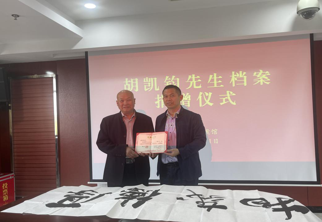 4月11日下午,岳阳市档案馆举行档案捐赠仪式,接受胡凯钧先生捐赠《胡凯钧书画册》。馆党组书记、馆长余友安为胡老颁发捐赠证书,胡凯钧先生的妻子、学生以及朋友到场,与档案馆相关工作人员一同见证。