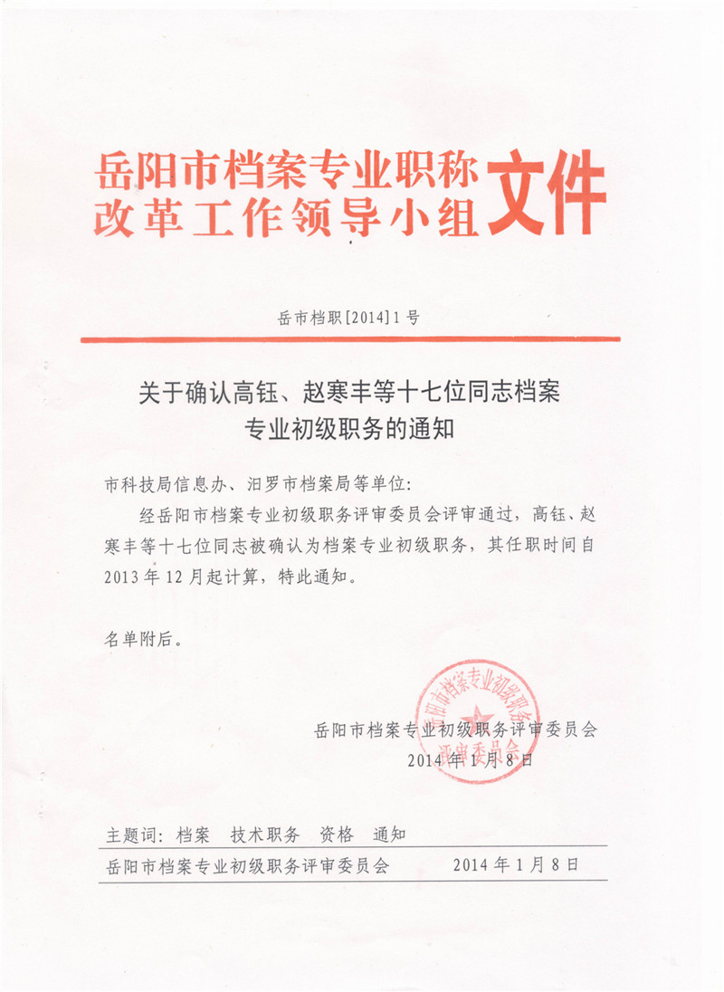关于确认高钰、赵寒丰等十七位同志档案专业初级职务的通知