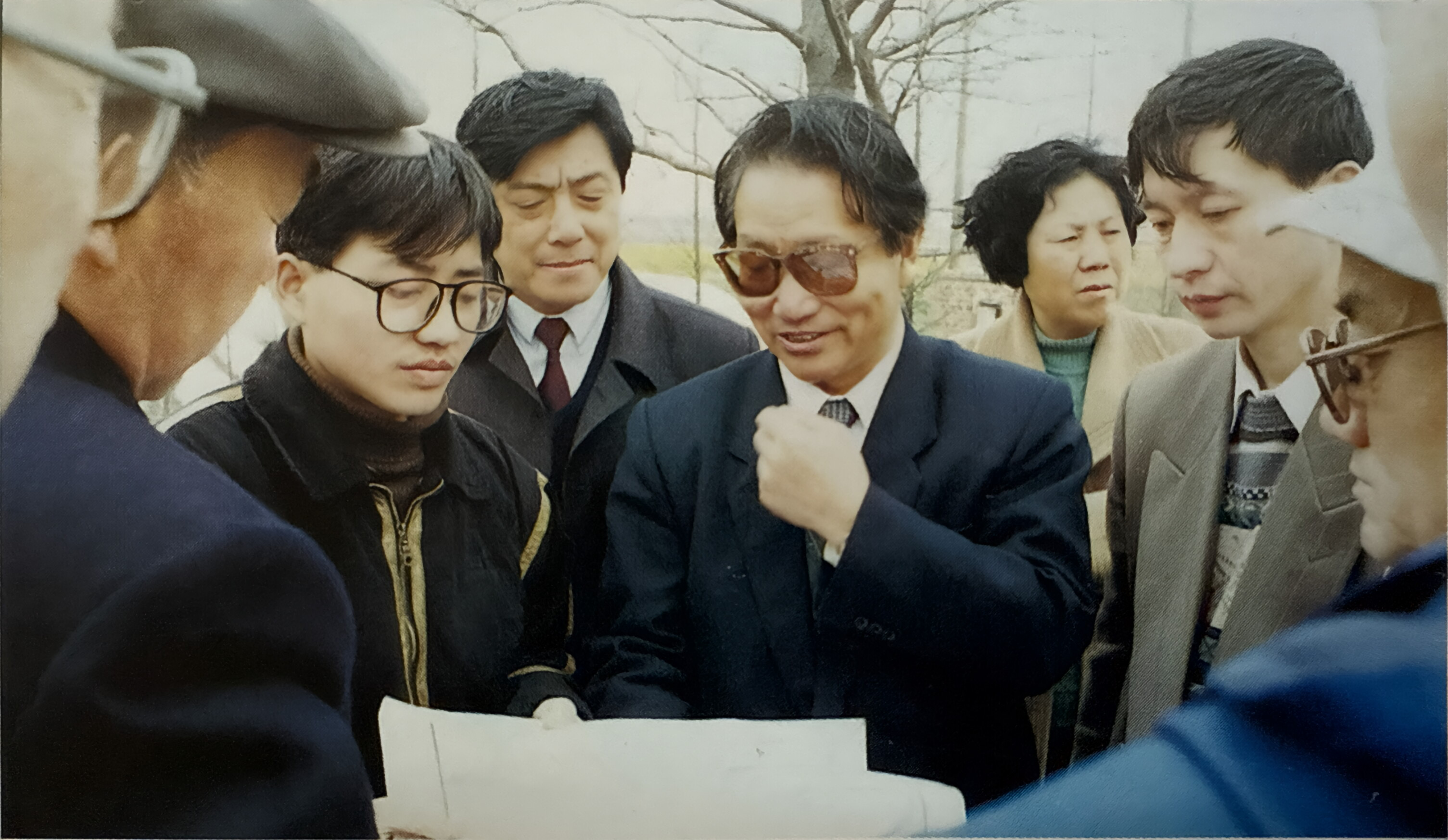 大桥总工程师鲁继俭(中)在现场研究大桥接线走向