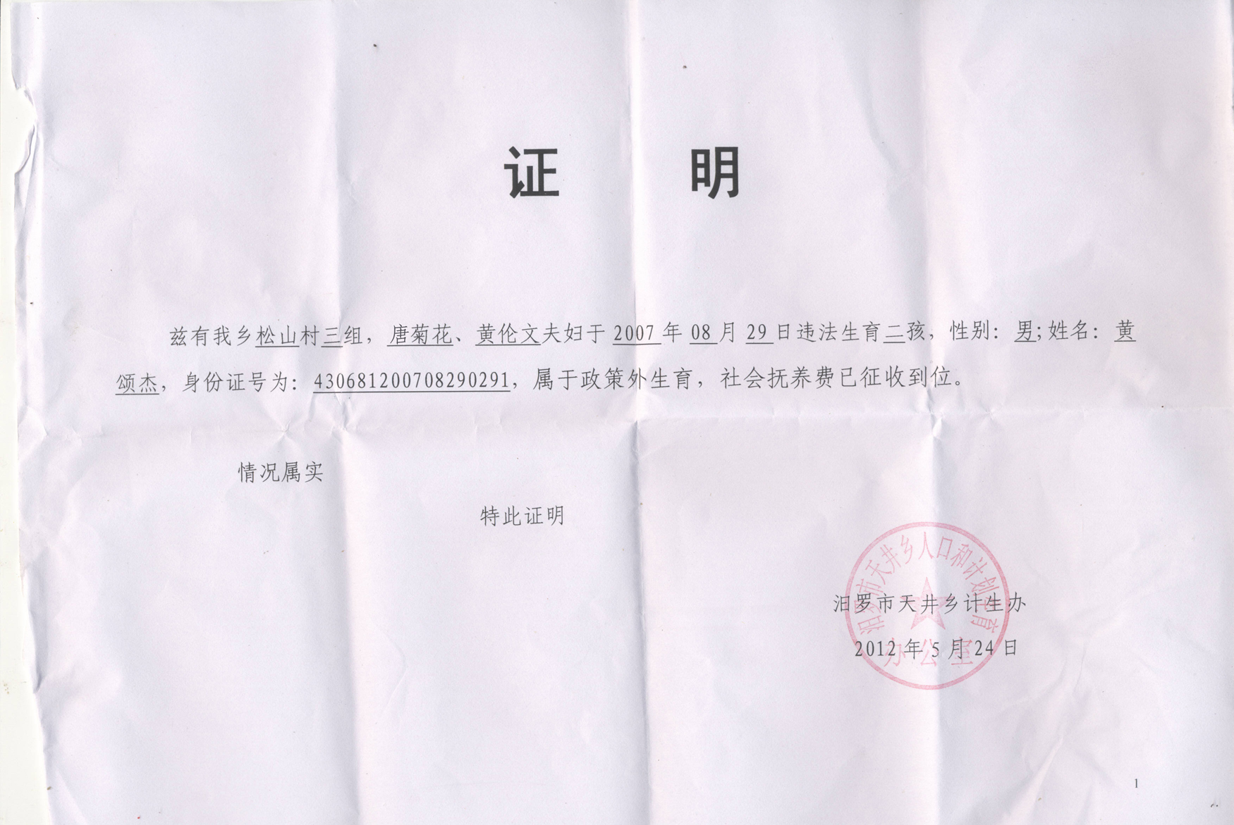 尊敬的市领导 你好!本人是汨罗市天井乡松山村三组06号,姓名:黄伦文,男 ,本人长期在外务工,现托家人去罗江镇办理计划生育证明盖章,当时工作人员不予盖章,原因:第二个小孩没有缴社会抚养费,当时我在本村已经缴纳过费用有证明,现在是我的第一个孩子黄颂尹读书,又在政策范围内,为什么不受理第一个政策内的人资料盖章,难道在政策内也要受到第二个小孩抚养费的牵制吗?距申请学位时间紧急,尽早回复 附件1:1231321 (1).jpg |
