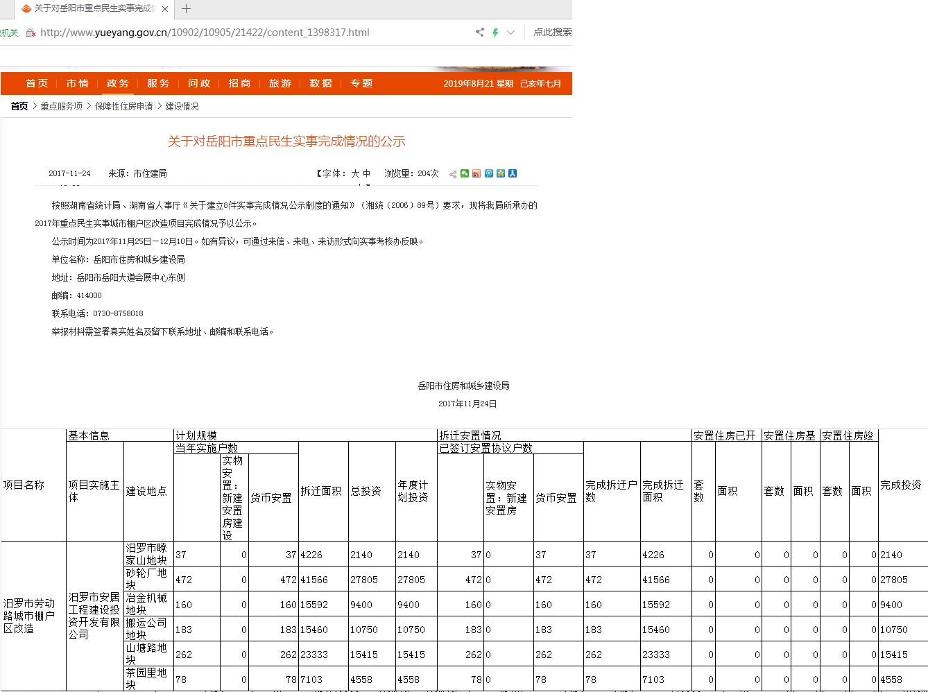 市人民政府、市住房和城乡建设局: 最近在浏览岳阳市政府网站时,发现一篇《关于对岳阳市重点民生实事完成情况的公示》的文章(文章链接地址:http://www.yueyang.gov.cn/10902/10905/21422/content_1398317.html),文章附表"2017年度11月岳阳市城市棚户区改造项目信息表"显示:汨罗市安居工程建设投资开发有限公司为项目实施主体的汨罗市劳动路城市棚户区改造项目包含汨罗市瞭家山地块、砂轮厂地块、冶金机械地块等六个地块,均已完成拆迁协议签订,均已完成年度投资计划。 目前,冶金机械地块等其他地块的棚户区改造均已完成,作为砂轮厂地块的居民,我们苦等多年还是未能盼来政府对我们棚户区的改造和关怀,我想问一下砂轮厂地块已完成投资计划的资金到哪里去了?烦请政府部门确认公示信息是否正确?谢谢。 附件1:yys.jpg |