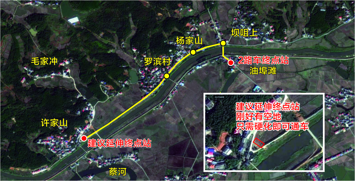 目前2号车设点在罗江镇油埠滩附近,极其不合理,给罗滨村、坝咀上、杨家山、蔡河、吴家山、毛家冲、许家山等村组成千上万人的出行带来了极大的不方便。每次这些村组的老人要走上几公里路乘坐公交车,汨罗近些年来这方面带来了极大的改善,取得不错的成绩。希望完善一下部分不合理的设站,做到真正的便民、利民工程。 建议2路车终点站延伸至罗滨村吴家山附近,此处有空地仅需硬化即可通车。详细见图。 附件1:未命名 -1.jpg |