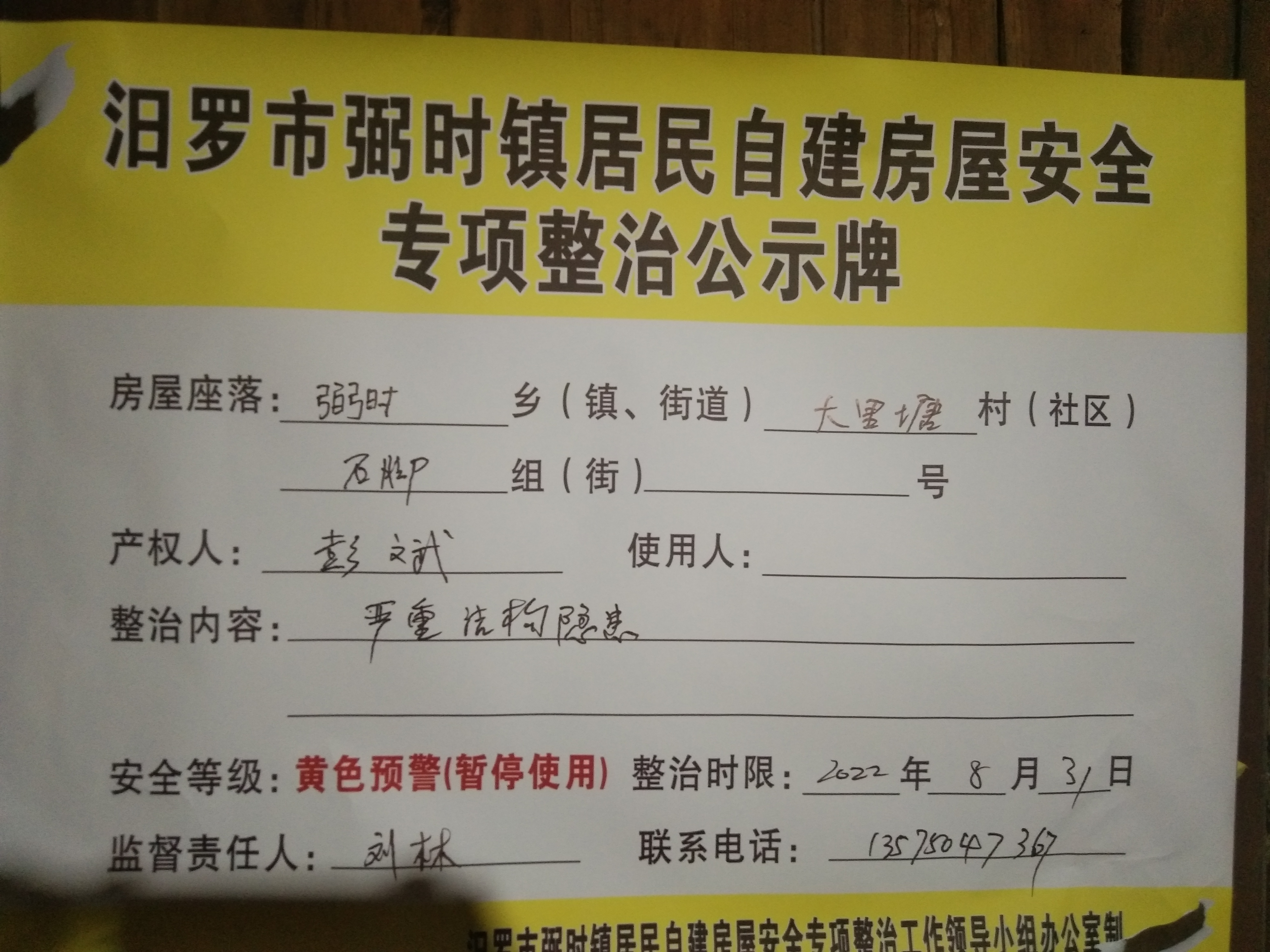 本人家住汨罗市弼时镇大里塘村石脚组1号,现住的土砖瓦房当地政府已认定为危房,要求8月31日停止使用,我已收到停用通知,但是没有给我解决住房问题。早2年前就递交过建房申请,附件有村代表及小组签字意见。村上和政府来回多次沟通都没有一个明确的答复,一直拖到现在。危房停止使用后我该住哪里?当地有哪些禁令?红线范围在哪里?我能否原基重建?急盼帮忙解决,谢谢! 附件1:危房停用通知书.jpg |