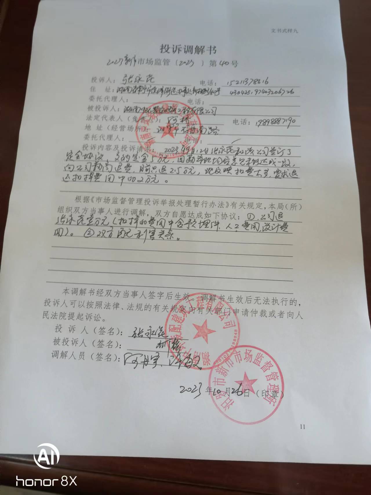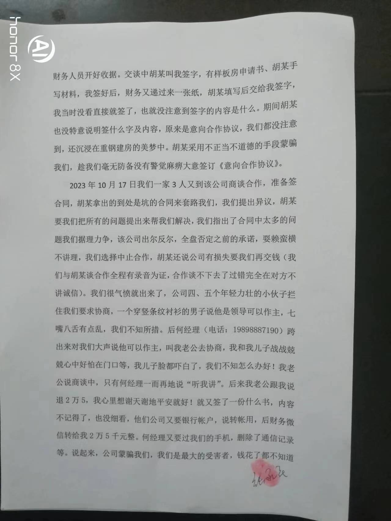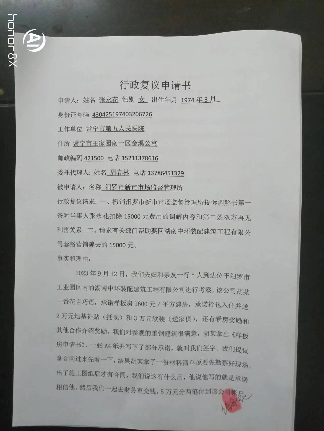 市长大人:您好!在您百忙之中给您添麻烦了!我叫张永花,是湖南省常宁市人,我不该轻信抖音小视频的误导宣传,被您辖区内的湖南中环装配建筑工程有限公司骗走1.5万元!该公司虚假宣传套路营销不知道蒙骗了多少消费者,我们只是其中之一。新市市场监督管理所在调解过程中,没能做到公正公平,做出了侵害我方合法权益的调解,涉嫌偏袒对方公司,我不知道怎么办,感觉状告无门,无助的感觉有谁懂!现申请行政复议,托您转交有关部门,在此万分感谢您! 行政复议申请书 申请人:姓名 张永花 性别 女 出生年月 1974年3月 身份证号码 43042519740320**** 工作单位 常宁市第五人民医院 住所 常宁市王家园南一区金溪公寓 邮政编码421500 电话1521137**** 委托代理人: 姓名 周春林 电话1378645**** 被申请人:名称 汨罗市新市市场监督管理所 行政复议请求: 一、撤销汨罗市新市市场监督管理所投诉调解书第一条对当事人张永花扣除15000元费用的调解内容和第二条双方再无利害关系。二、请求有关部门帮助要回湖南中环装配建筑工程有限公司套路营销骗去的15000元。 事实和理由: 2023年9月12日,我们夫妇和亲友一行5人到达位于汨罗市工业园区内的湖南中环装配建筑工程有限公司进行考察,该公司胡某一番花言巧语,承诺样板房1600元/平方建房,承诺拎包入住并送2万元地基补贴(抵现)和3万元软装(送家俱),还有看房奖励和其他合作介绍奖励,我们对参观的重钢建筑很满意,胡某拿出《样板房申请书》、一张A4纸并写下了部分承诺,就叫我们签字。我们提议拿合同过来先看一下,结果胡某拿了一份材料清单说要先勘察好现场、出了施工图纸后才有合同,我们说这有什么用,他说他写的就是承诺相信他。然后我们一起去财务室交钱,5万元分两笔付到该公司帐户,财务人员开好收据。交谈中胡某叫我签字,有样板房申请书、胡某手写材料,我签好后,财务又递过来一张纸,胡某填写后交给我签字,我当时没看直接就签了,也就没注意到签字的内容是什么。期间胡某也没特意说明签什么字及内容,原来是意向合作协议,我们都没注意到,还沉浸在重钢建房的美梦中。胡某采用不正当不道德的手段蒙骗我们,趁我们毫无防备没有警觉麻痹大意签订《意向合作协议》。 2023年10月17日我们一家3人又到该公司商谈合作,准备签合同,胡某拿出的到处是坑的合同来套路我们,我们提出异议,胡某要我们把所有的问题提出来帮我们解决,我们指出了合同中太多的问题我们据理力争,该公司出尔反尔,全盘否定之前的承诺,耍赖蛮横不讲理,我们选择中止合作,胡某还说公司有损失要我们再交钱(我们与胡某谈合作全程有录音为证,合作谈不下去了过错完全在对方不讲诚信)。我们很气愤就出来了,公司四、五个年轻力壮的小伙子拦住我们要求协商,一个穿竖条纹衬衫的男子说他是领导可以作主,七嘴八舌有点乱,我们不知所措。后何经理(电话:1989888****)跨出来对我们大声说他可以作主,叫我老公去协商,我和我儿子战战兢兢心中好怕在门口等,我儿子脸都吓白了,我们不知怎么办好!我老公说商谈中,只有何经理一而再地说“听我讲”。后来我老公跟我说退2万5,我心里想谢天谢地平安就好!就又签了一份什么书,内容不记得了,也没细看,他们公司又要银行帐户,说转帐用,后财务微信转给我2万5千元整。何经理又要过我们的手机,删除了通信记录等。说起来,公司蒙骗我们,我们是最大的受害者,钱花了都不知道是怎么回事,后续房子怎么建也没着落,一切从头开始。我们被迫签了终止协议,当时我们心里只想保平安,哪敢想公平正义,收到25000元退款后急匆匆地“灰溜溜”地离开了公司。 后来我们打12315投诉,得到快速回应。2023年10月26日我们夫妇5点半就出发,驾车322公里,9点不到就赶到了汨罗市新市市场监督管理所,调解员作了询问笔录,我们提交了《意向合作协议》、《样板房申请书》、胡某手写材料、合同样本等拍照打印出来的证据,还有《合同纠纷情况说明》,说明上写明了我们的诉求:全额返还定金,并适当补偿我们。大约10点左右,两名调解员带我们赶到该公司进行调解,该公司人员百般狡辩,不容我们说出实情,并多次打断我们的发言,我们感觉有理说不出,憋屈着有理无处说!9月25日,我与调解员沟通过,问能退多少钱,调解员肯定地说多少有点退,退多少他们不敢保证,还说跟公司也沟通过,他们同意退。我心中打起了退堂鼓,不想去、怕,我爱人坚持要去并说我们不与他们争吵,心平气和讲道理,应该不会受到伤害,再说还有政府部门。在调解中我们提交了和胡某的一段通话录音,在电话中胡某再次明确承诺过“拎包入住”,但在调解时胡某又对“拎包入住”作了歪曲的辩解,前后矛盾,丑态百出。结果调解员出具了调解书,何经理就叫财务微信付给我10000元,收到钱后我们紧跟调解员走出公司,我们一刻不敢停留上高速回家! 事情的经过就是这样,我们有充分的证据,该公司涉嫌欺诈,不诚信经营,搞套路坑骗消费者。我们的诉求如下: 一、我方选择放弃与该公司的合作,是因为该公司没有道德底线、涉嫌欺诈、蛮横耍赖、不讲诚信!我方选择放弃合作没有过错,不应承担违约责任。对方公司在宣传、合作过程中存在明显过错,应承担违约责任,双倍返还定金。 二、新市市场监督管理所调解过程中存在瑕疵,请求更正,理由如下: 1. 我方发言多次被