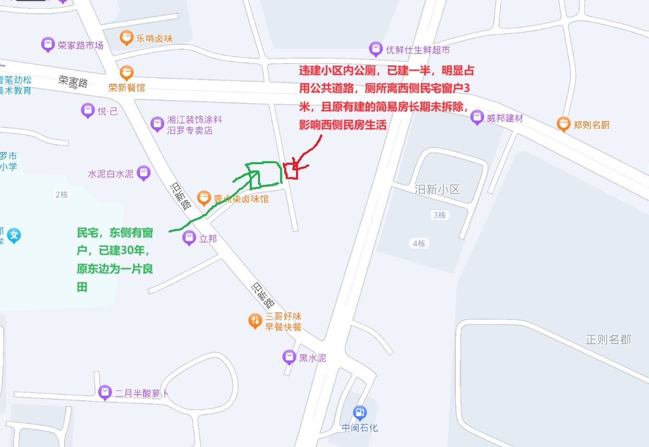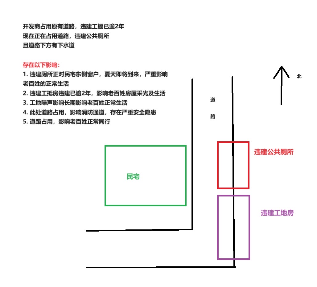 我叫彭群辉,女,现年62岁,文化程度不高。家住汨罗市汨新路67号同排最后一栋,在此盖建自住房生活已超30年。东侧原为良田,被征收后建商品房小区。我自住房与小区之间为道路,本地居民长期通过该道路出行。小区开发商占用道路违建公棚已超两年多,这两天趁放假,又已占用道路违建公共厕所,离我自住房不到3米,刚好对着我家窗户。开放商原来违建的公棚本已影响我家出入、采光和其他居民通行,此次又想再建公厕,严重侵犯了老百姓的权益,影响老百姓卫生健康,影响此处居民的通行,对消防安全也埋下了巨大的安全隐患。 现举报开发商及建设单位违法违规事实如下: 1.占用原有道路,违建工棚已逾2年 2. 现在正在占用道路,违建公共厕所 违建行为对我家及附近居民影响如下: 1. 违建厕所正对民宅东侧窗户,夏天即将到来,严重影响老百姓的正常生活 2. 违建工抵房违建已逾2年,影响老百姓房屋采光及生活 3. 厕所如此靠近民宅,对居民的卫生安全造成巨大影响,也给卫生文明城市创建带来挑战 4. 工地噪声影响长期影响老百姓正常生活 5. 此处道路占用,堵塞消防通道,存在严重消防安全隐患 6. 道路占用,影响老百姓正常通行 本人诉求如下: 1. 拆除违建的工地房 2. 停工在建的违建厕所并拆除 3.清理此处道路,保障居民消防安全和卫生安全 本人与工地人员协商,但是他们置之不理。我一个老百姓不知道什么途径才能解决这个问题,恳请政府相关部门为本人做主,解决老百姓的难处。我年纪比较大了,有高血压等基础疾病,无力阻拦他们开工,也不能天天盯在此处,只能拜托各位帮忙合法合理解决这个问题 |