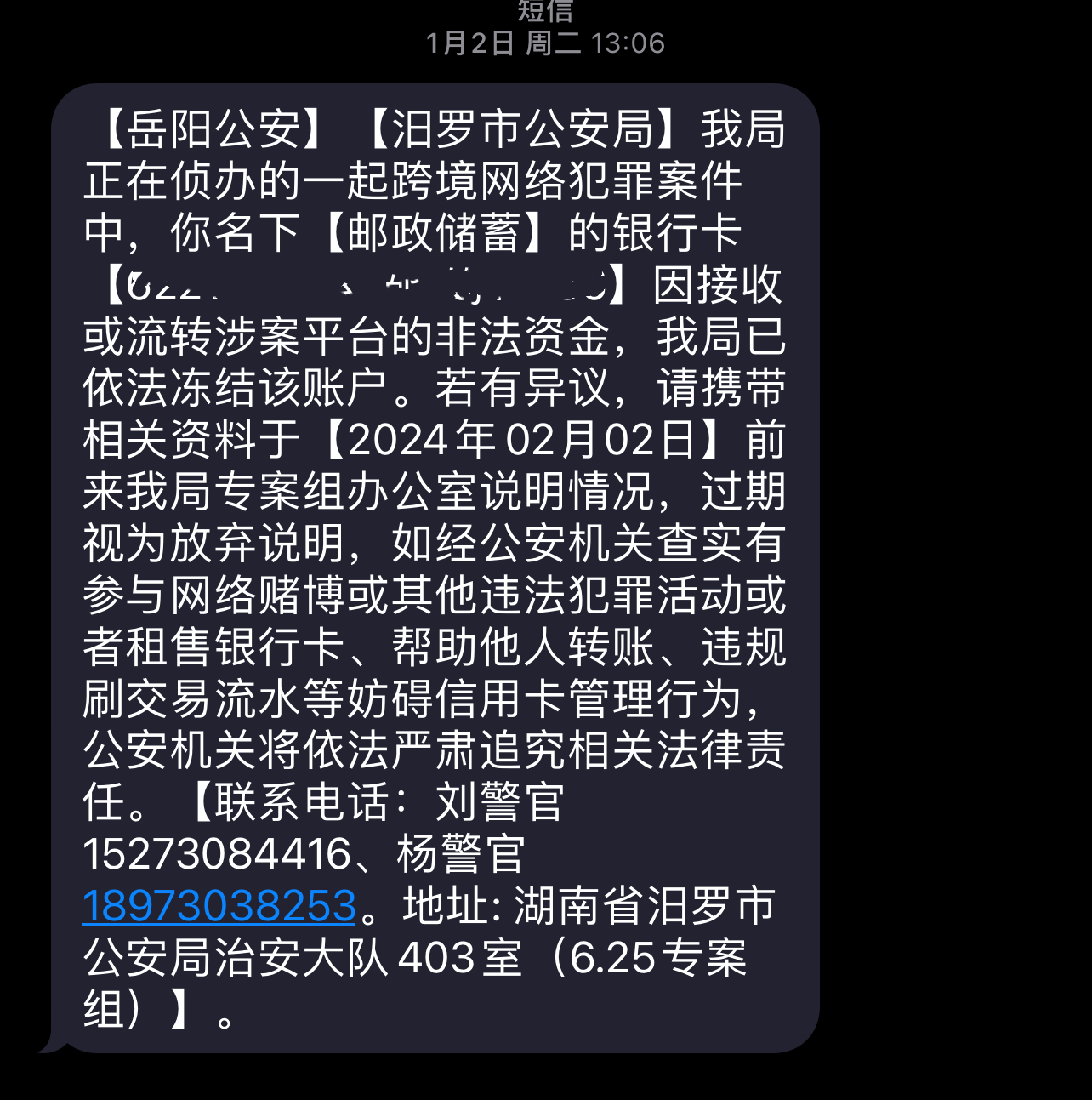 | 回复内容: | 网友: 您好!您反映的“银行卡被冻结”一事,经我局治安大队核实办理,特此回复:我局正在侦办一起跨境网络犯罪案件,有查到您名下这张卡与该网上非法平台有过资金交易,我局根据相关法律规定依法冻结了你的涉案账户,该账户目前冻结期为6个月。如您有其他疑问可联系办案单位电话:15273084416、15273086223、15273089293、18973038253。我局有安排专人进行接线解答,请您在工作日内拨打专案组民警电话。 汨罗市公安局 2024年4月22日 |