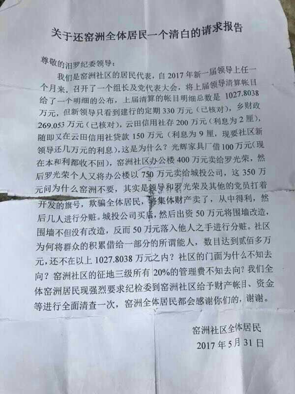 标题: 关于还窑州社区全体居民一个清白的请求报告