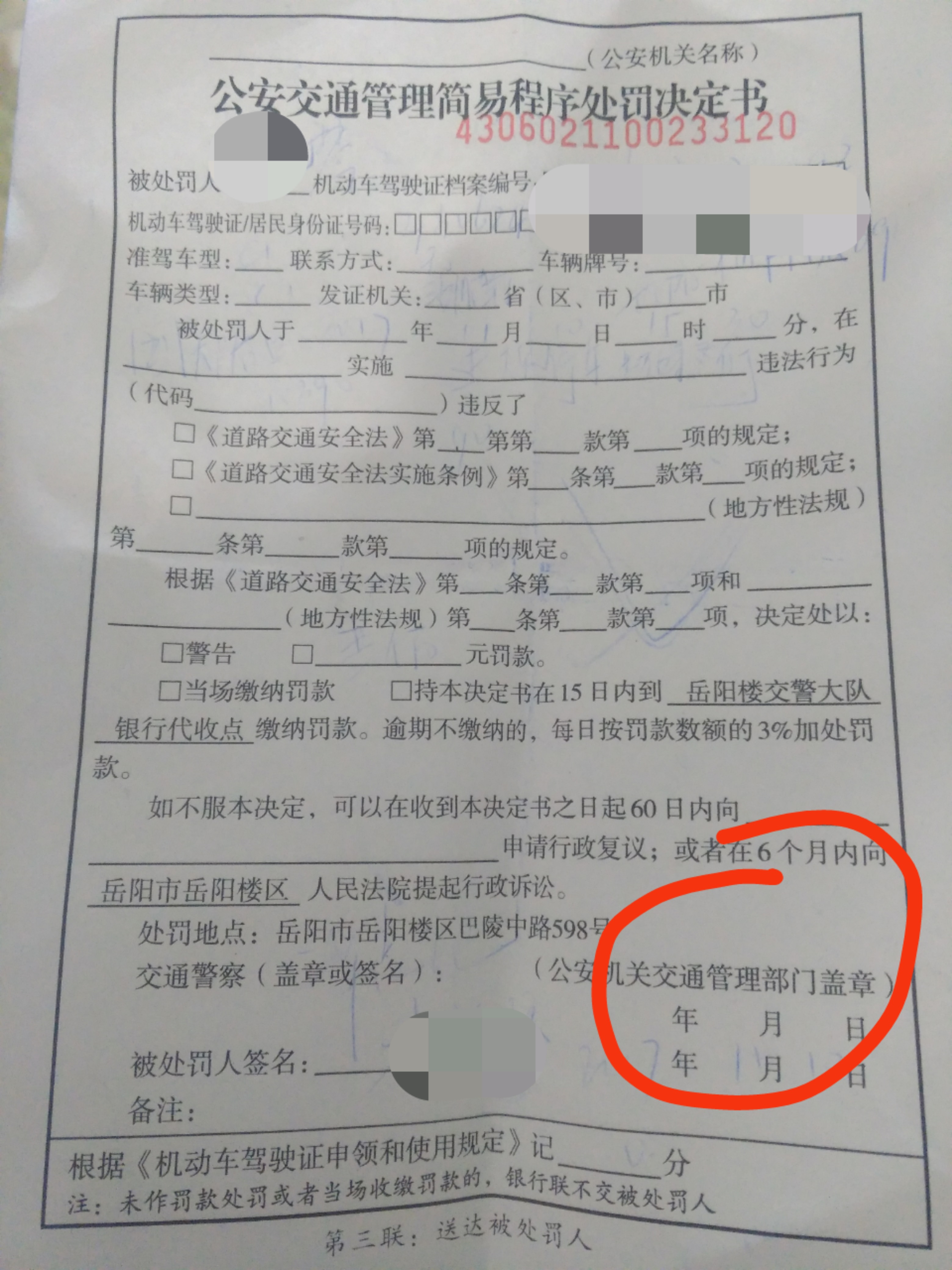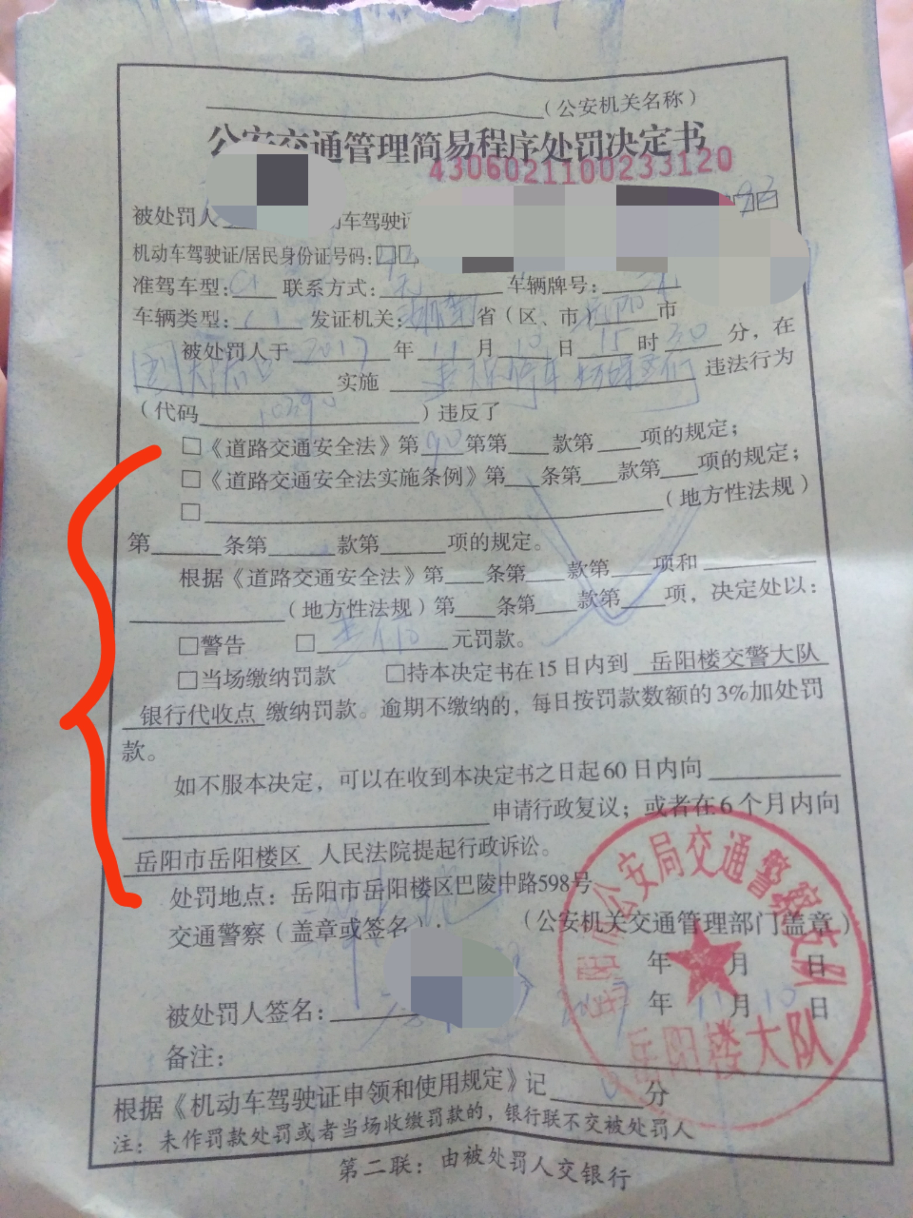 | 内容: | 事由: 本人于17年11月10日15时30分在五里牌路路边停车5分钟,执法人员给我车上锁后离开了。结果我从发现车被上锁到找交警解锁的时间花了30分钟。同时也接到了岳阳楼交警大队出具的处罚决定书 (文书照片见附图)。事情原委介绍完毕。 投诉: 1.执法文书印刷错误。岳阳楼交警大队出具的执法文书违反条款第一条印刷为:《道路交通法》第90第。 2.决定书罚则不清楚。罚款一百元的罚则显示空白。 3.处罚决定书未加盖公章。处罚决定书的第三联,送达被处罚人联未盖公章。 4.申请行政复议事宜未告知。不服处罚决定的,60日内可向谁申请行政复议未告知。 疑问: 堂堂一个国家机关,出具这样的执法文书,让老百姓如何是好,是该遵守呢还是任由执法人员这样随意执法,知法犯法。作为岳阳楼大队的上级机关竟然还回复“处罚决定书经统一印刷,没有错误”。没有错误的话,那么请问“《道路交通法》第90第”的内容是什么? |