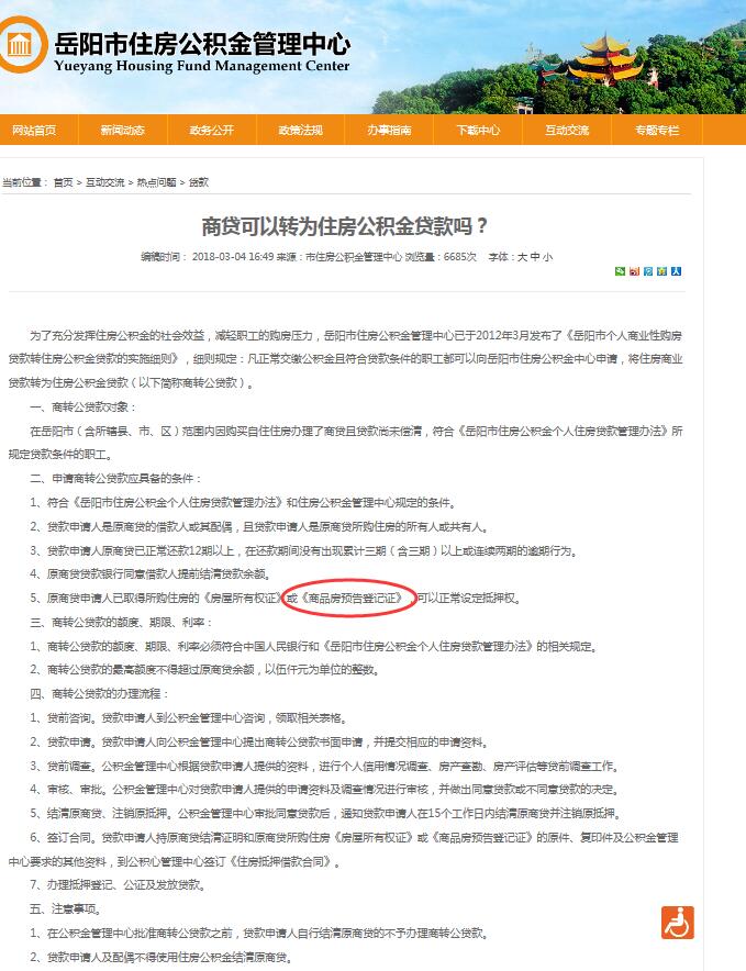 | 回复内容: | 穆先生:您好!感谢您对住房公积金的关心与关注! 就您咨询的住房公积金事宜现予回复:根据《岳阳市住房公积金个人住房贷款操作实施细则》规定:原商贷所购房还不能办理《不动产权证书》的,必须要求原商贷所购房的《不动产权证书》办妥后才能办理商转公贷款。 |