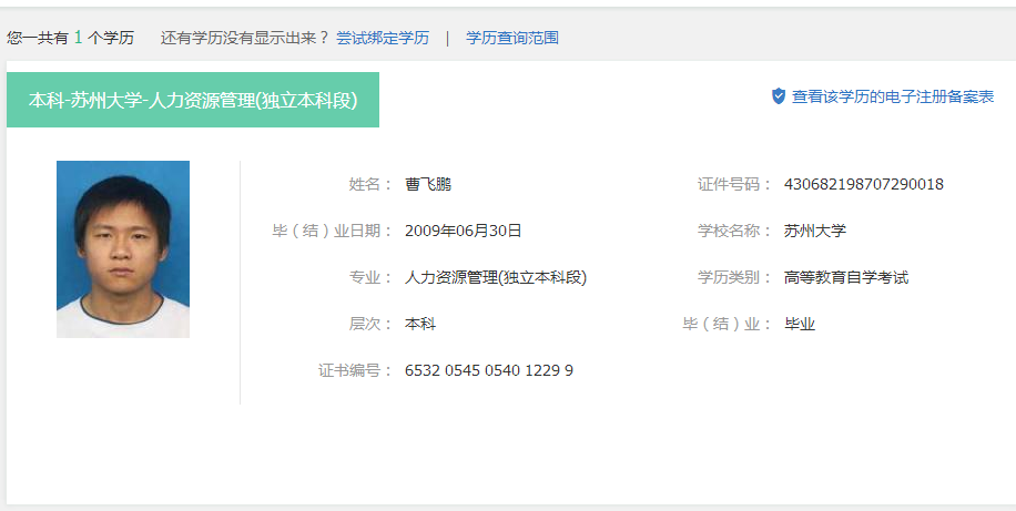 | 内容: | 本人通过阅读《关于做好我省2017年度经济专业技术资格考试考务工作的通知》湘人社考函〔2017〕22号,得知一些本年考取中级经济师的一些情况,目前已经开始了中级经济师的学习。其中有不明白的地方,还望解惑。 本人2005年临湘一中高中毕业,2009年于苏州大学人力资源管理专业毕业(成人自考),同年到岳阳市邮储银行参加工作至今,学信网查看的截图请看附件。按照22号文件复审的要求,非全日制的要提供之前的学历证书,但是我目前高中证书已经遗失了,请问在这种情况下我可以报考中级经济师么?考试通过后复审能通过么? |